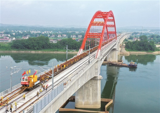 7月18日,中铁十一局建设者在资水特大桥上进行无砟轨道铺设作业。当天,常益长铁路项目轨道铺设顺利通过控制性工程资水特大桥,为常益长铁路早日通车运营奠定基础。湖南日报全媒体记者 郭立亮 通讯员 孟健 摄影报道