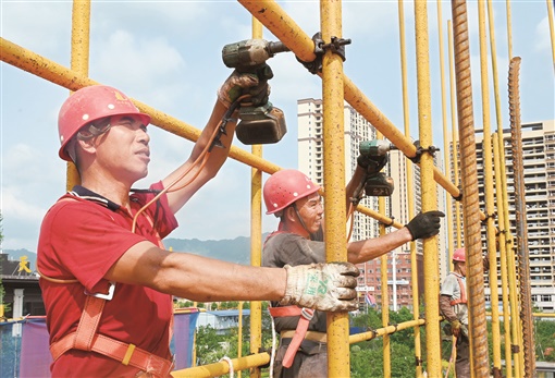 上图:7月17日,洞口县文昌街道一重点工程项目建设工地,工人头顶烈日忙施工。滕治中 摄