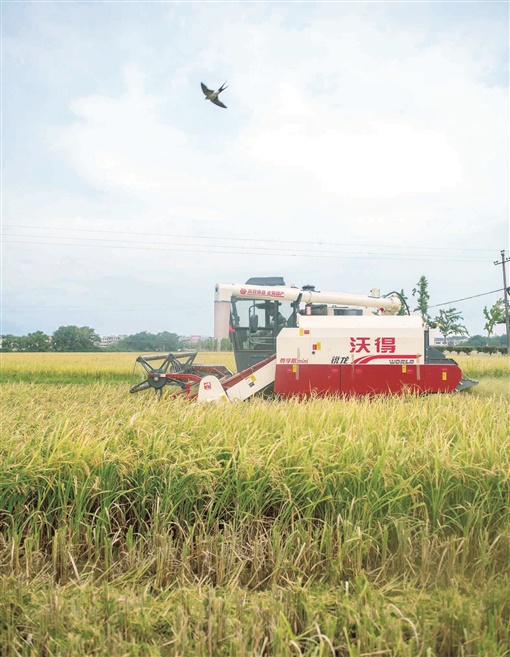 上图:7月18日,道县原地正禾农场水稻种植基地,农机手驾驶机械收割早稻。