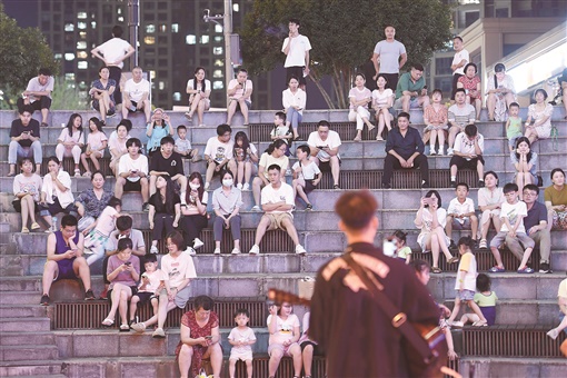 7月18日晚,长沙市梅溪湖梅澜坊街区,市民坐在湖畔聆听音乐会。当天,文化和旅游部发布《关于第二批国家级夜间文化和旅游消费集聚区名单的公示》,公布了拟入选第二批国家级夜间文化和旅游消费集聚区名单。我省长沙市梅溪湖梅澜坊街区、长沙市红星街区、岳阳市岳阳楼旅游区、常德市柳叶湖河街、永州市零陵古城、怀化市洪江古商城6地入围。湖南日报全媒体记者 辜鹏博 摄