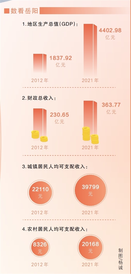 10年间,岳阳这座农业大市已向工业强市、三产旺市转变,形成以石油化工、食品加工、现代物流、文体旅游4条产业链为有力支撑,装备制造、电子信息、生物医药等新兴产业多点发力的产业格局,全市地区生产总值由2012年1837.92亿元增至2021年4402.98亿元,连续跨越2000亿元、3000亿元、4000亿元3个台阶。
