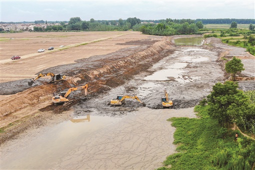 7月19日,桃源县木塘垸镇“旱改水”工程建设现场,挖掘机在有条不紊地清理淤泥、整修坑塘,有效改善当地农业生产条件,达到路相通、渠相连、旱能灌、涝能排。童险峰 摄