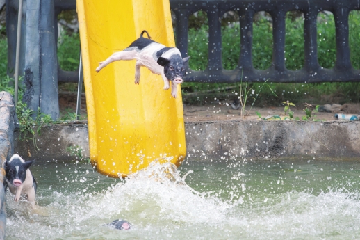 中午1时30分左右,正是一天最热的时候,宁乡市湘都生态农庄的花猪乐园里,一群小花猪正在玩跳水。8只3个多月大的花猪排队站在1米多高的跳台上,在饲养员的引导下,“扑通、扑通”挨个跳下玩耍。