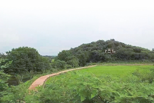 隔着偌大一片田垄,石鱼山远远地伫立在我的眼底。身旁自侃为“八零后”的钟老指点着介绍道,“这条山好像一条泥鱼,当地人就叫泥鱼山,你看,摇头摆尾的,鱼头就对着育泉河,好像在喝水,又好像要入水的样子哩。”我第一次听到一个土生土长的老人家称山为“条”,这显然不是他们平常口语的习惯。看来,当地人真是把这座山当成一条鱼了。