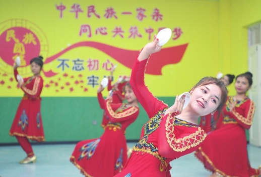 7月19日,新城西门村,湖南援疆工作队帮扶的高昌区第四中学,学生在排练碟碗舞《石榴花开》。 |