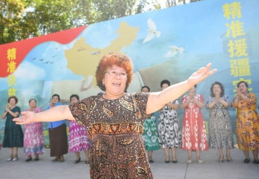 7月18日,新城西门村,村民在湖南援建的红石榴广场上载歌载舞。 |