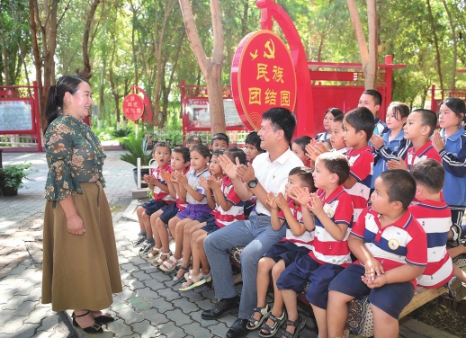 7月19日,新疆维吾尔自治区吐鲁番市高昌区亚尔镇新城片区新城西门村,湖南援疆工作队帮扶的高昌区第四中学民族团结园,村民热依汗·古丽(左一)与学生分享和习近平总书记见面时的激动时刻。 |