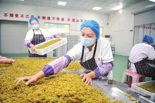 7月18日,新城西门村丝路明珠农业生物科技有限公司车间,村民买克力古丽·艾合买提在分拣葡萄干。目前她月收入有3500元。 |
