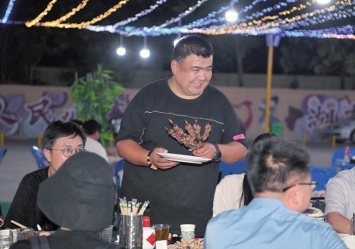 7月18日晚,新城西门村,红石榴夜市老板艾尔肯·祖农为顾客上红柳烤肉。他承包湖南援建的夜市大排档,生意红火。 |