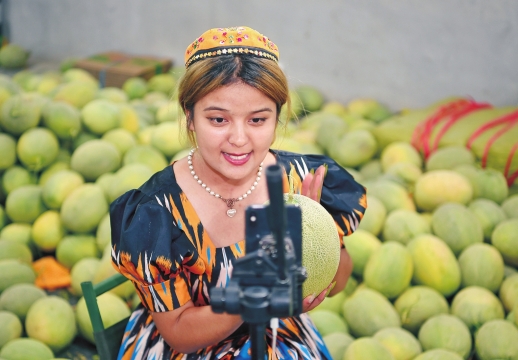 7月19日,新城西门村,哈力·米拉在红石榴电商直播基地直播卖哈密瓜。 |