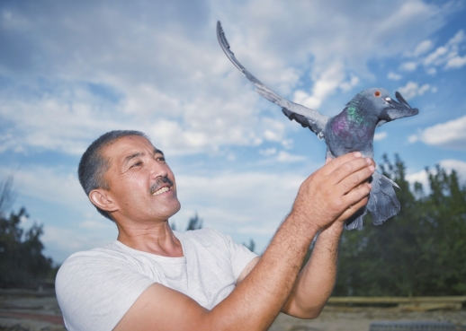 7月18日,新城西门村,村民吾买尔·买买提查看自己家养的鸽子。湖南援疆工作队为村里所有养鸽户打造了一组标准化鸽笼,扶持壮大养鸽产业。 |