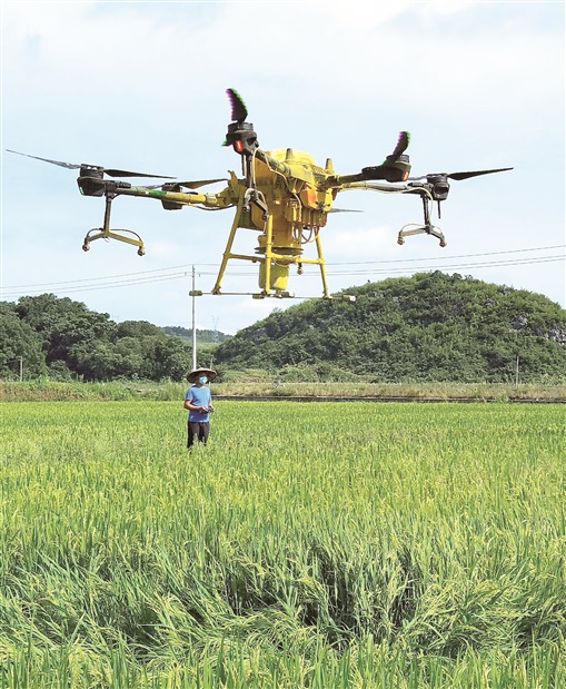 7月21日,宁远县冷水镇庄屋村,技术人员操控无人机在田间喷施有机农药。时值中稻抽穗扬花关键期,高温高湿容易导致病虫害发生,当地及时组织农技员、驻村干部深入田间地头,指导村民开展病虫害监测和防控,确保粮食丰产丰收。乐水旺 摄