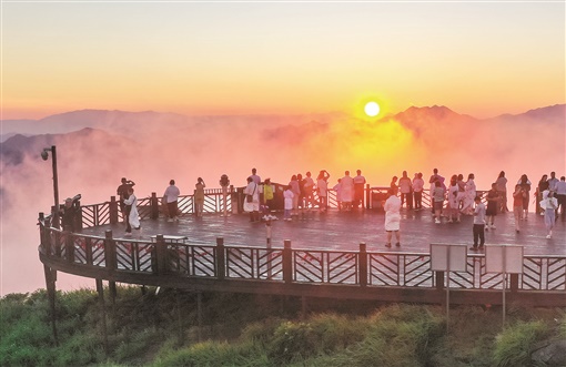 7月23日清晨,蓝山县云冰山风景区,游客在观看日出。进入暑期,该县云冰山、百叠岭、湘江源国家森林公园等自然风景区景色秀美、气候宜人,迎来不少省内外游客开启夏日“避暑游”“生态游”。 彭华 摄