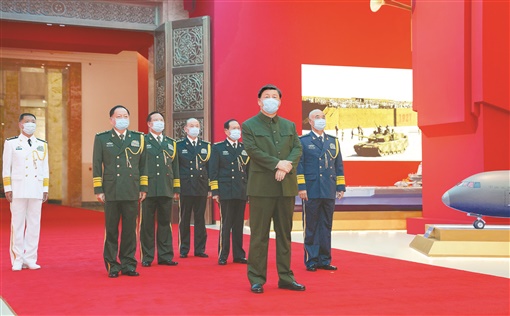 下午4时30分许,习近平来到中国人民革命军事博物馆,步入展厅参观展览。展览聚焦以习近平同志为核心的党中央领导国防和军队建设的伟大实践,安排8个单元展区,设置“党在新时代的强军目标”、“重整行装再出发”、“砺剑铸盾 奔向一流”、“大好河山 寸土不让”、“爱我人民爱我军”、“深情励三军 奋进新征程”等重点展项,通过1400余件文物实物、630余张照片、近百套武器装备模型以及大量图表、视频、艺术作品、互动项目等,生动展示了新时代国防和军队建设的壮阔历程和伟大成就,充分展现了人民军队忠诚维护核心、矢志奋斗强军的昂扬风貌。习近平不时驻足观看,认真听取讲解,询问有关情况。