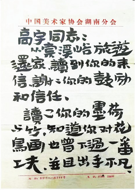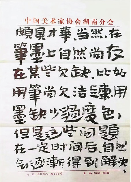 21岁那年,无意间从电视上晓得了湖南双峰县出了个王憨山,大笔大墨,笔墨的派头有天天隔窗相望的真实山头的憨实厚重,打个点点都有几百斤的分量。于是,便斗胆冒冒失失亲笔写信过去讨教了。憨老厚道,大约半个月的时候,就写了回信。第一眼瞟到信封上比我当时的大拇指还壮实的字,像是儿时看见的墙头的招贴的气势一样,几乎被吓一跳。信的内容,除了因善良而吐露的鼓励与夹杂着哄人的话语,也实实在在给予了教诲,使我感到温暖并且多了对于明天的一点朦胧的期待。