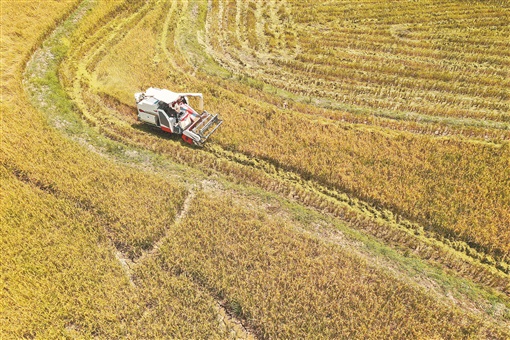 7月29日,新田县三井镇小坪塘村,农机手驾驶农机在收割早稻。时下,新田县14.1万亩早稻陆续进入收割期,机械化作业成为金色田野里一道亮丽风景。近年来,该县加大水稻农业机械化推广力度,全县机耕率达99.3%。 钟伟锋 摄