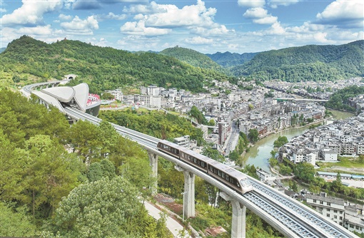 7月30日,国内首个“磁浮+文化+旅游”项目——凤凰磁浮观光快线正式开通运营,凤凰县成为全国唯一拥有磁浮旅游轨道的县级城市和旅游景区。凤凰磁浮观光快线列车设计时速为100km/h,全程运行时间大约30分钟,现有4座主题车站,融合凤凰美景、湘西文化、工艺特产等元素。该观光快线的开通将实现高铁、磁浮无障碍换乘,让游客在欣赏美景的同时,更便利地直达凤凰古城景区。图为7月29日,一列磁浮观光快线列车缓缓驶出凤凰揽胜站。