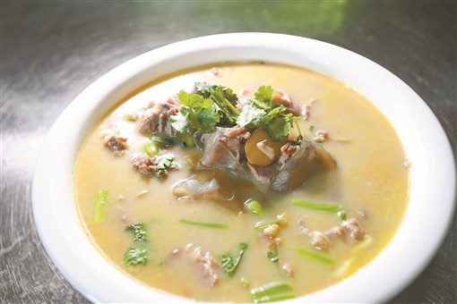夹起羊肉,没有丝毫膻味,肉质清甜,入口即化,粉皮弹牙爽口。盛上一碗山泉水烹煮的羊肉汤,暖胃暖心,让人大呼畅快。