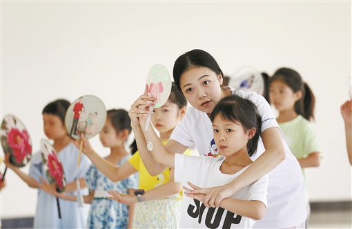 7月31日,郴州市人民西路湖南省昆剧团教室,老师在指导孩子们学习昆曲动作。省昆剧团暑期少儿昆曲公益课堂近日开班,60多名“小戏迷”在昆曲老师的带领下,感受戏曲文化的魅力,丰富暑假生活。