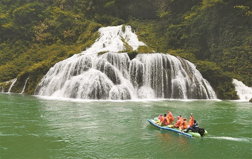 皮筏艇飞驰,沿途黑蛇湾、鸳鸯洲、水洞子瀑布等风景,转眼即逝。水洞子瀑布是茅岩河漂流一绝——从数十米高的崖壁泻出,漫流过三级高低不平的石壁,形成长短不一的三叠水瀑,似白练飞落茅岩河中。只要游客提出要求,船工便会驾艇从瀑布中穿越而过,仿佛到了花果山“水帘洞”。