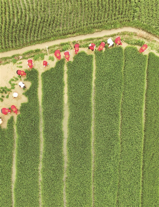 8月4日,道县寿雁镇玉蟾岩稻作文化园,党员志愿者在帮助种粮大户扯晚稻秧苗。当天,该镇组织党员志愿者深入一线,帮助缺劳力种粮户抢插晚稻,确保不误农时。