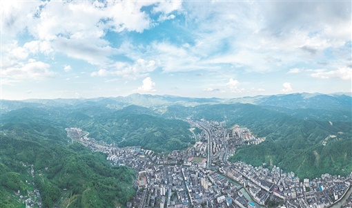 8月15日,蓝天白云下的桂东县。近年,地处罗霄山脉南端的山城桂东凭着890米的平均海拔、85%的森林覆盖率、23.7℃的夏季平均气温及远超均值的负氧离子含量,成为了远近闻名的康养、旅游、避暑胜地。