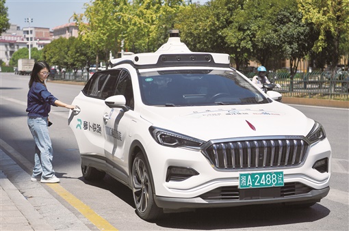 8月15日,长沙市岳麓区学士路,市民搭乘自动驾驶出租车出行。湖南阿波罗智行运营的百度“萝卜快跑”自动驾驶出租车近日在湖南湘江新区正式开启示范运营,拉开了长沙自动驾驶商业化试点帷幕。此次试点初期开放试乘站点300多个,运营范围覆盖湘江新区梅溪湖、洋湖、大王山等区域,智能驾驶长沙示范区175公里开放测试道路。 湖南日报全媒体记者 傅聪 王晗 摄影报道