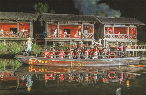 8月20日晚,常德桃花源旅游景区秦溪河畔,游客乘坐游船观看大型溪流漫游实景演出《桃花源记》。暑假期间,《桃花源记》实景演出的人气持续火爆,浸入式观演模式让游客流连忘返。