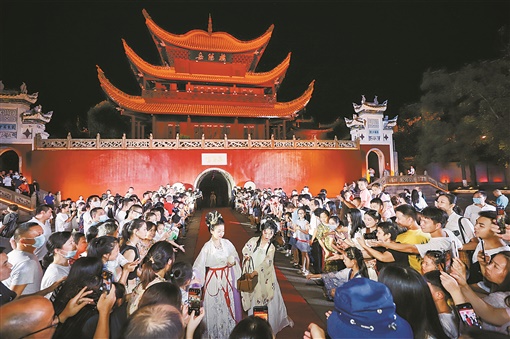 夜幕中的岳阳楼,灯光绚丽,民乐袅袅,汉服飘飘;青石板铺就的汴河街,人流如织,“梦回宋朝”主题活动、长乐抬阁故事会轮番上演,引得掌声不断;历经沧桑的洞庭南路,巴陵戏、洞庭渔歌等非遗表演令人目不暇接……
