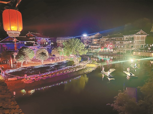 8月27日晚,通道侗族自治县皇都侗民族文化村坪坦河上的灯光秀。近年,该县坚持“亮化、净化、绿化、美化、序化”并举,乡村颜值不断提升,吸引八方宾客前来看美景、赏夜色、品民俗。