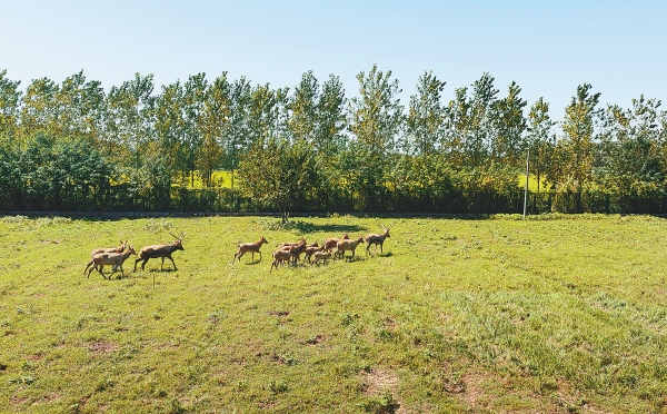滩洲芦苇青青,高过人头,混夹着气味浓烈的蒿与蓼,铺天盖地绿到天边。湿地深处,游荡着一群群麋鹿,或在草地奔走,或在水洼流连,长着树杈般大角的雄性“首领”,繁殖季内总往角上挂藤蔓植物,自我打扮,煞是可爱。
