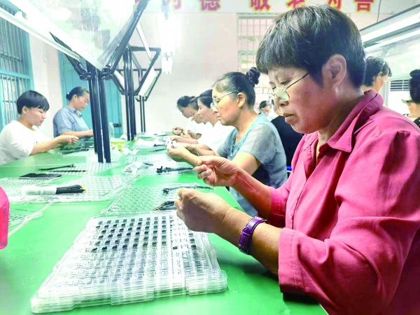走进皂市镇十坪村富博科技乡村振兴车间,近60名村民正在加工电脑和手机数据线线束。汤明华坐在桌前,手脚麻利。55岁的他乐呵呵地回答来人的问话:“我在家一个月可以拿3000元左右,家里3亩多橘园还有2万多收入。我一领到工资,就给远在天津打工的妻子发了一个视频,和她算账说,回家工作比在外打工强,每月工资是净剩,没啥开销。在外打工工资看起来高,除去租房等开销,手里剩不下几个钱。她答应我过年回来,我们两口子再也不用分隔两地了。”