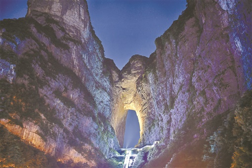 武陵山大道,高耸的七十二奇楼在夜空中闪亮,恍如海市蜃楼;澧水河畔,暖黄色的灯光勾勒出一大片璀璨古建筑,那是大庸古城。索溪河亮如银河,溪布街霓虹灯闪烁。人们在奇楼里看戏探险,在古城里散步购物,在酒吧里纵情高歌……吉祥物山宝宝、鲵娃娃在高楼幕墙上蹦跳。