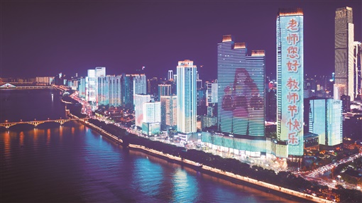 9月10日晚,中秋节遇上教师节,长沙湘江两岸多个地标建筑显示屏陆续滚动播出“但愿人长久 千里共婵娟”“老师您好 教师节快乐”等字样,营造出浓厚的节日氛围。