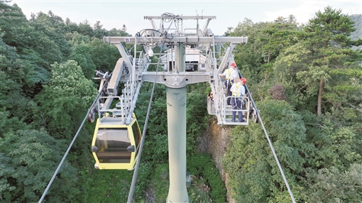 杨家界索道共有1971米长、53个轿厢,14个索道支架,共248个运转轮。高明华从2004年开始从事索道检修工作,在杨家界索道已服务8年。穿行在悬崖峭壁间,攀爬几十米高的支架,盯缆绳、听异响……这就是他每天的工作。“特别是听异响这一块的巡检,因为山间的风声很大,与索道运行的声音混杂在一起,所以巡检的时候我们得精神高度集中,确保不漏过每一个细节。”