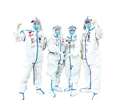 新冠肺炎疫情发生以来,州医人勇往直前,白衣执甲,担当起抗疫一线的主力军、先锋队。预检分诊、发热门诊、隔离病房、定点医院、方舱医院……到处都有他们的身影;防护培训、应急演练、核酸采样、疫苗接种……哪里都有他们的声音。2020年,19名医务人员主动请缨,逆行出征,与湖北人民并肩作战,打了一场漂亮的疫情防控阻击战。2021年,坚持全州疫情防控“一盘棋”,派遣6批次121名医务人员支援古丈、凤凰、张家界等州内外核酸采样,3批83人次护理人员驻点州方舱医院,完成疫苗接种17.7万余人次,完成核酸“愿检尽检”5万余人次,花果山定点医院救治专班全年保持备战状态;2022年,27名医务人员驻守花果山定点医院19天,守护湘西州第一道防线。为全州疫情防控贡献了“州医力量”!