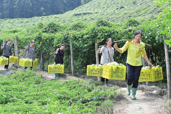 9月14日,城步苗族自治县汀坪乡横水村百香果产业基地,农民用胶筐运输采摘好的百香果。金秋时节,该村近百亩黄金百香果逐渐进入成熟期,当地种植户加紧采摘、分级、装箱,及时销往广西等地市场。 严钦龙 摄