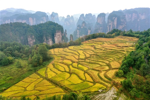 9月14日,张家界市武陵源风景名胜区杨家界的“空中田园”,位于悬崖峰林之巅的橙黄稻田与周围的山峰构成一幅绚丽的金秋画卷。