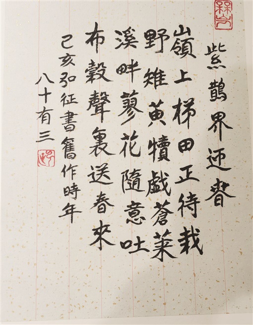 前两年,我们在涟源曹家村建老农活动中心。这个中心,由晚晴书屋、晚晴广场、晚晴诗湖组成。书屋里,有弘征捐的书;诗湖上,有弘征创作的歌颂故乡的诗。而这时候,他的病情很重了,已离不开氧气,出不了家门了。听说我们在为老农们建设一个阅读、健身、娱乐的场所。他仍高兴地、积极地参与。并在握笔很吃力的情况下,他坚持用毛笔工工整整地书写出他创作的一首旧体诗……