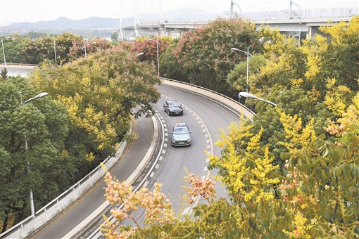 9月21日,长沙三汊矶大桥东,道路两侧的栾树在“黄花红果”的装扮下,显得特别亮丽。栾树也叫“灯笼树”。金秋时节,栾树开花结果,花果同枝,绚丽多彩,成为长沙一道亮丽的风景线。湖南日报全媒体记者 田超 摄