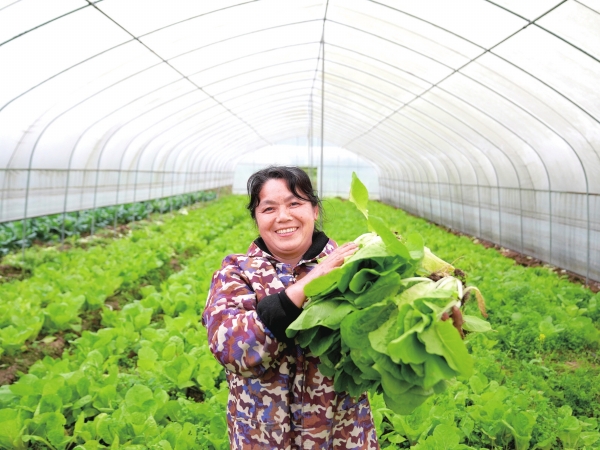 在产业园内,搬迁户曹伍妹在自家蔬菜大棚内收割青菜。“今天我要准备150公斤青菜,明早送给客户。”曹伍妹自豪地说,她家的蔬菜直供超市。