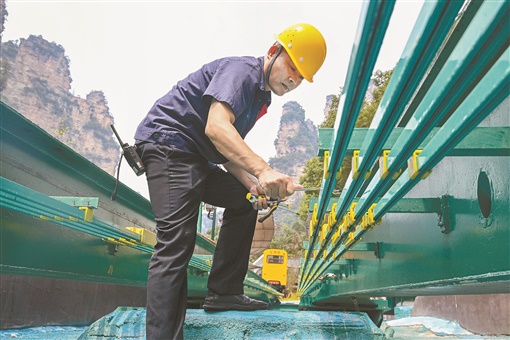 9月13日,张家界国家森林公园十里画廊,观光电车工作人员廖少波在检查电车钢轨。多年来,他和同事们一起坚守岗位,每天巡检不留死角,守护电车运行安全。 |