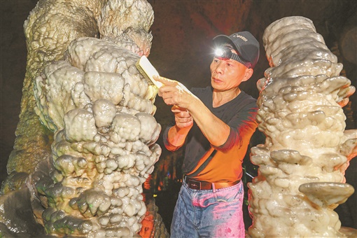 9月13日,张家界黄龙洞景区,保洁工毛国平在清洗钟乳石。20年来,他坚守在阴冷潮湿的溶洞里清洗钟乳石,只为给游客呈现最美的自然景观。 |