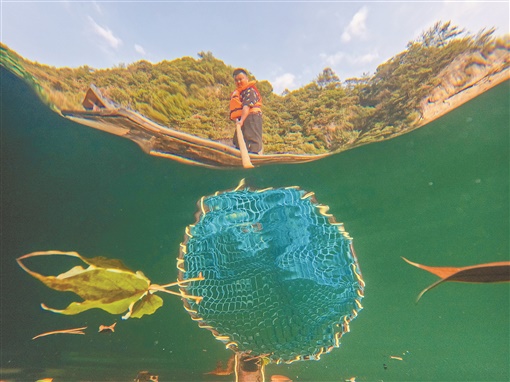 9月13日,张家界武陵源宝峰湖风景区,工作人员卓璇在清理湖面上飘落的枯枝树叶等漂浮物。在这个岗位上,他一干就是13年,只为守护一泓净水,让游客有一个舒适干净的游览环境。 |
