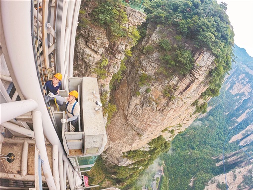 9月13日,张家界武陵源风景区百龙天梯,电梯巡检工刘杰(右)、廖再强对电梯缆绳进行检查。当游客乘坐这部垂直高差355米的悬崖户外电梯在峰林间上下穿行时,电梯巡检工在电梯的钢架或吊厢上反复对缆绳、吊厢进行现场巡检,排除一切可能存在的安全隐患。 |