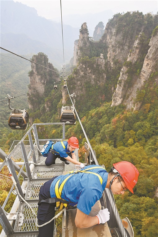 9月13日,张家界武陵源风景区天子山索道,检修工余骏伟(前)、覃正发在索道支架上巡检设备。索道检修工每天早上从索道开机到晚上关机,时刻处于紧张的工作状态之中。发现问题,第一时间排除故障隐患,为游客安全乘坐缆车保驾护航。 |