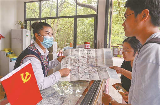 9月14日,张家界武陵源风景区咨询台党员示范岗,欧华在为游客提供旅游咨询服务。今年42岁的她,日常工作就是为游客指路、规划游玩线路、应急救助、送凉茶等。 |