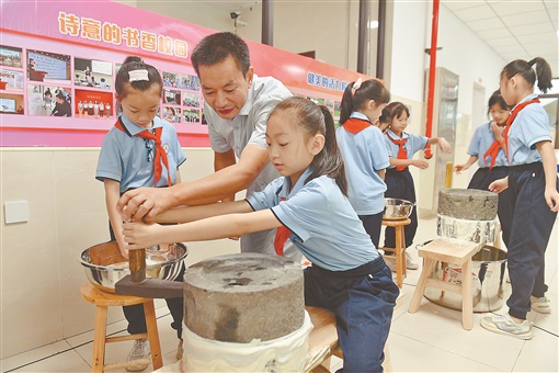 9月22日,长沙市雨花区长塘里崇德小学,学生在体验磨豆腐。当天,“雨花溆浦一家亲”进校园活动在该校举行。活动通过“农业+教育”劳动实践模式让学生现场磨制豆腐,分享农作物带来的丰收喜悦,了解雨溆帮扶成效和乡村振兴工作。