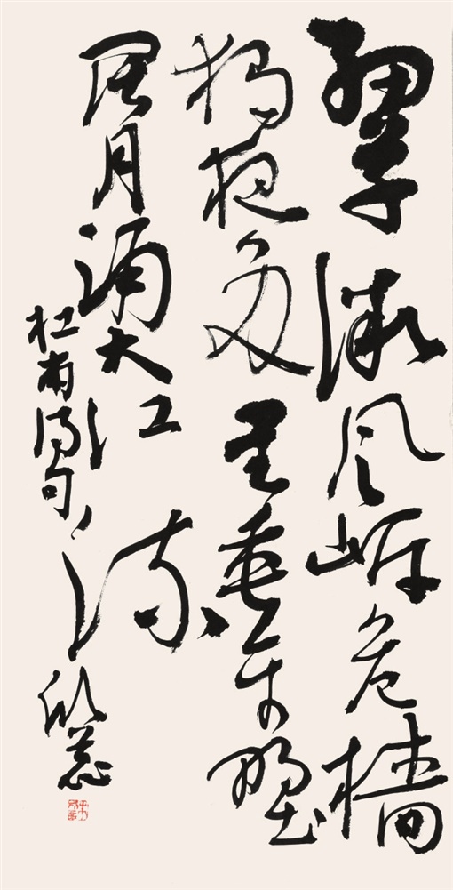 “深识书者,唯观神采,不见字形”,当完全浸染在一位书家的作品中,追寻到背后的真实性情,可谓“见字如面”。“字”在此时就成了符号,消融了笔墨的内涵,越过笔法、结体、章法,怀素书法尤以恣性狂放动人心魄。“忽然绝叫三五声,满壁纵横千万字。”感受到草圣因性情而发,激情奔放,笔端线条似能化龙飞去。 “三月山房暖,林花互照明。”立在欣蕊大草《周敦颐游大林寺》巨幅作品之下,横势如千军,纵势如幽壑,点画如泉水激石,可以感受书者笔下任情恣性,然后书之。想象得到,众友齐聚一堂笔墨挥洒,酣畅淋漓,窗外景和春明,欣蕊自取斋号“三月山房”正源于此诗此境。整幅作品中黑色如苍莽的山,白处是河流、是烟云古道,黑白的沉哑暗灭处亦光华闪烁,有三月江南桃花,有瓜洲渡口夜雪,有大漠直上孤烟,有古道西风瘦马,有云卷云舒的天空、天长地久的阡陌,更有倚栏人的清愁。
