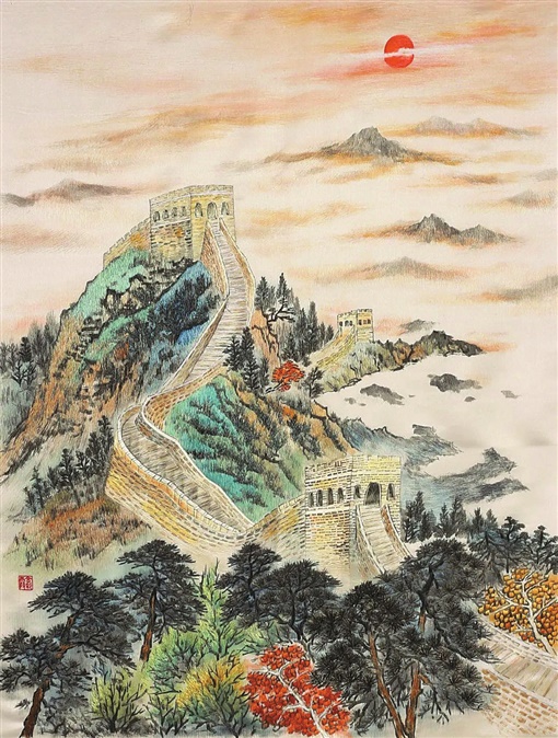 湘绣《长城》长80厘米、宽60厘米,是一幅单面绣。湘绣最具特色之处在于将中国传统的绘画艺术融于湘绣之中,《长城》由成新湘指导,省湘绣研究所设计师唐磊原创手绘,两名“90后”绣工邓佳玉、欧艳飞共同协作完成。设计师唐磊有着十多年的山水画功底,创作过多幅以长城为主题的画作。而绣工邓佳玉、欧艳飞虽为“90后”,但刺绣经验也相当丰富,尤在山水刺绣上见长。创作中,唐磊在色彩基调上改变了凸显长城冷峻威严的冷色调,通过旭日东升营造了明亮的暖色调,绘制在长城边的一棵棵松树坚定挺拔,力求展示生机盎然、蓬勃向上的力量。一幅小小的绣品最考验绣工的技艺和功力。绣制过程中,两名绣工运用十几种湘绣针法,采用颜色丰富、粗细相间的丝线、绒线,来体现景别及明暗色调的变化,实现刺绣与画相融,让作品看起来栩栩如生。“这幅作品中,太阳与云雾的表现上采用了细如发丝的蚕丝绣线来刻画,刺绣效果光亮、富有质感。”邓佳玉介绍,湘绣《长城》刺绣时间紧、质量要求高,在沟通好采用的针法、丝线及颜色之后,她们加班加点用了约60个工时完成作品。